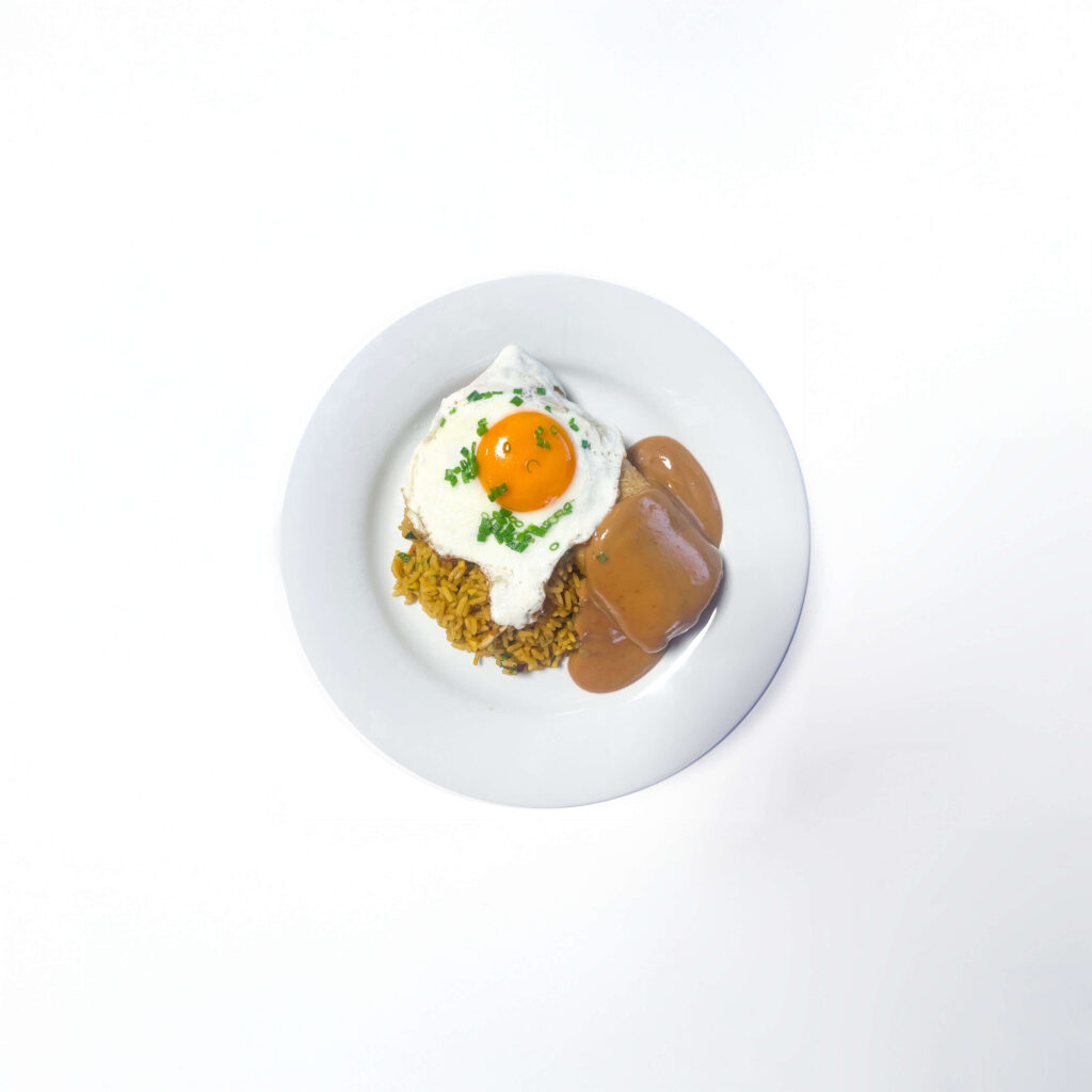 Kip-ham loempia met nasi, gebakken ei en satésaus