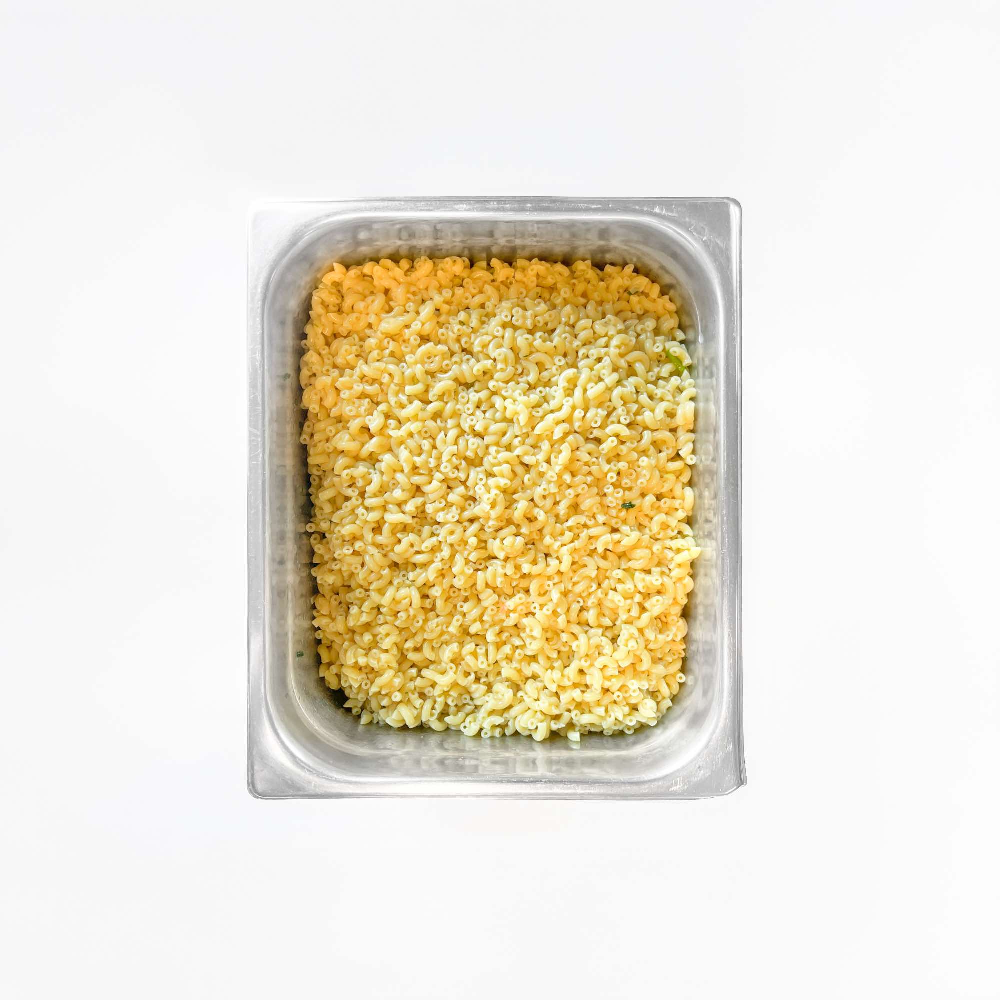 Stap 3: Meng de saus door de macaroni zodat het 1 geheel wordt. Doe de macaroni in een rvs bak en verwarm de macaroni op 150’c in de oven voor 10 min.