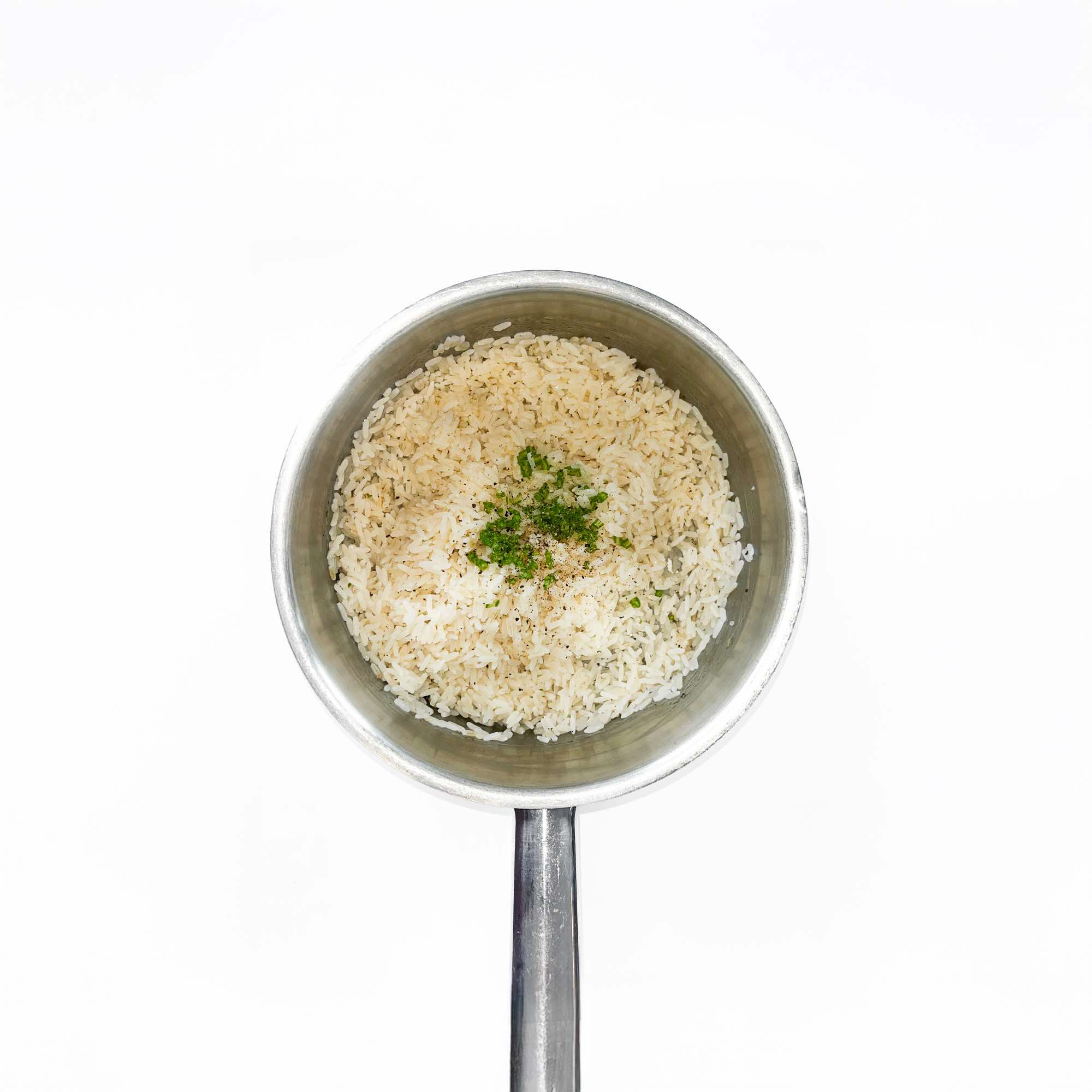 Stap1: Kook de rijst gaar in een pan en voeg boter, gehakte bieslook, peper en zout toe naar smaak.
